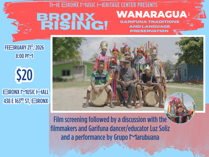 - Saturday 2/21, 8 pm, a ticketed ($20) film screening/discussion/performance on Garifuna music and dance at the Bronx Music Hall