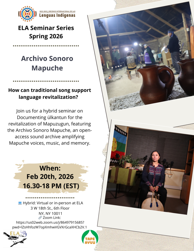 - Friday 2/20 at 4:30 pm, hybrid/at ELA, a free talk about traditional song with the Archivo Sonoro Mapuche